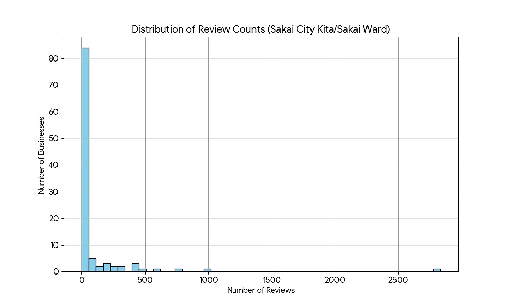 一例として、大阪府堺市(政令指定都市)の市街地では100件あれば競合優位を保てると考えられます。横浜市であれば200件、東京都大田区であれば350件以上の口コミを集めることが望ましいと考えられます。詳しくは記事末尾に当社の調査分析を掲載しました。