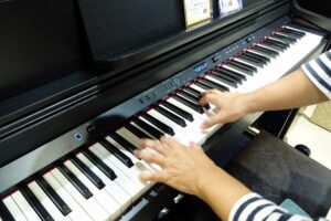 ピアノの場合は弾き語りもできますし、左手でコードを弾きながら右手でメロディーを弾くという即興風のソロ演奏も可能です。ピアノはメロディーも弾ける点で、少し難しいといえます。