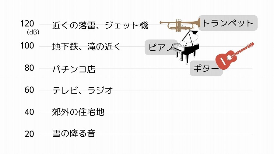 表にはありませんが、ピアノの100dBは、地下鉄内の騒音と同じくらいの大音量です。