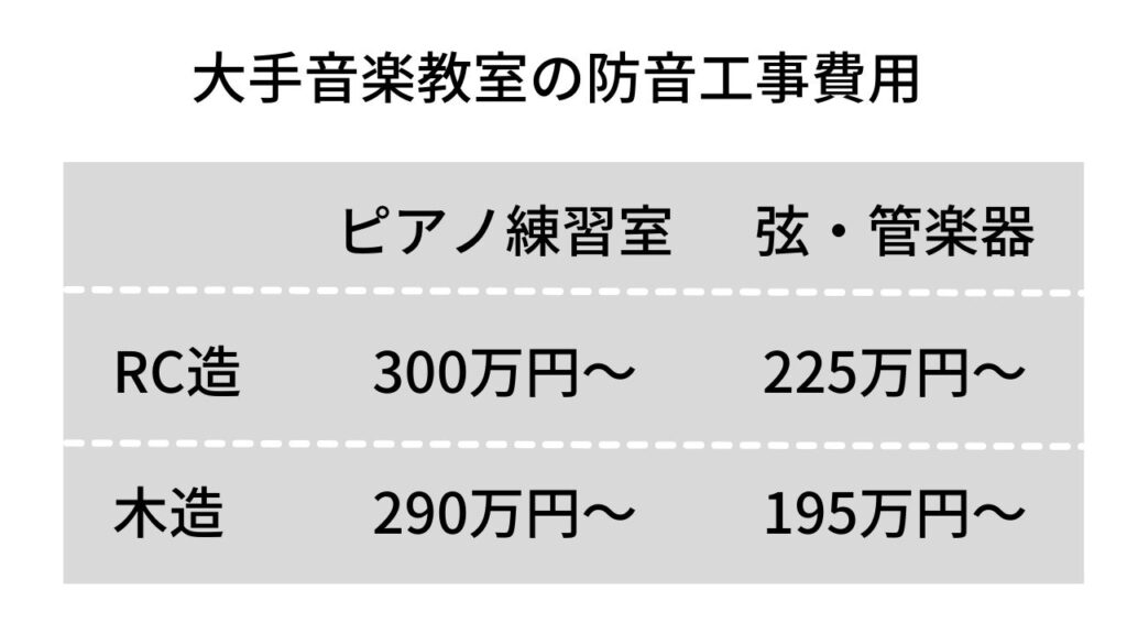 一般に防音工事専門の会社に防音リフォームを頼むと、「6畳のピアノ練習室で290万円から」といった相場感になります。