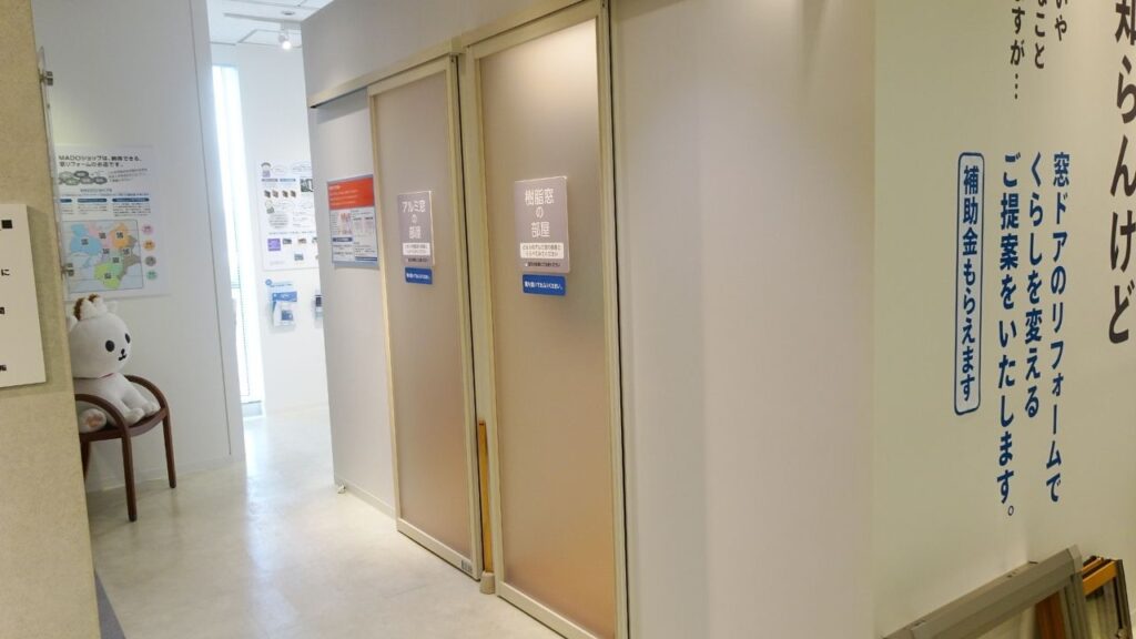 ショールーム内の防音体感コーナーでは、窓を開け閉めして効果を確かめる事ができます。ここでは異厚複層ガラスの内窓を体感できますが、高い遮音効果が感じられました。