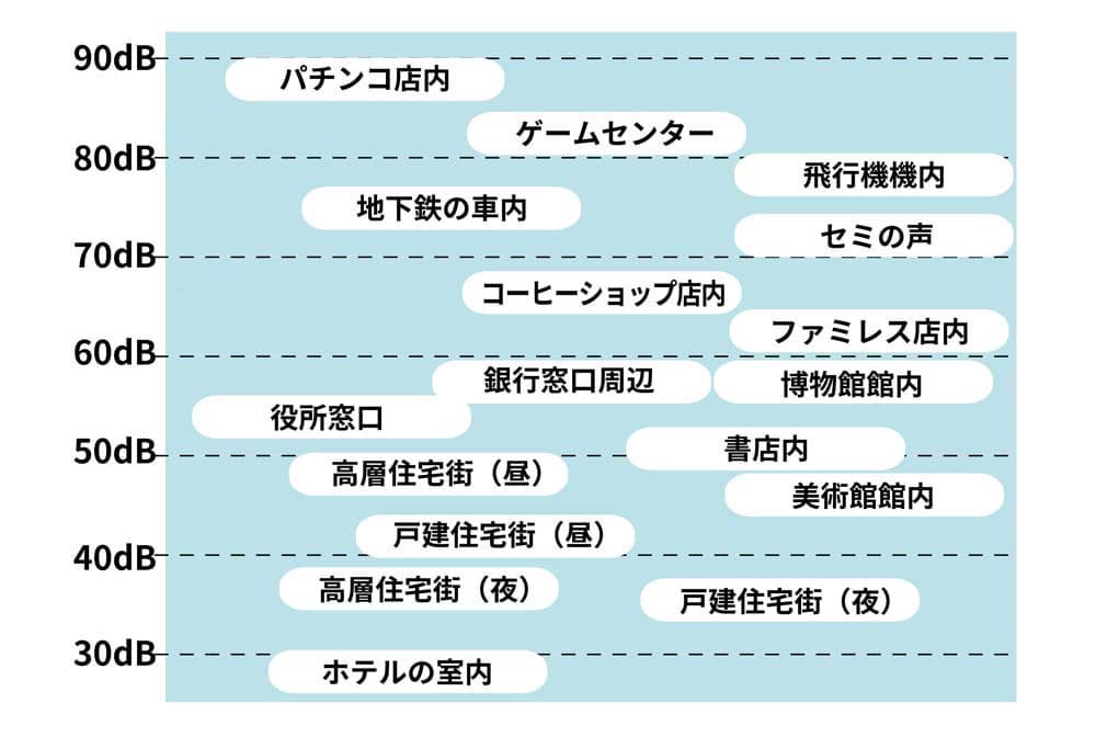 上の図でわかるとおり、昼間の住宅街の騒音レベルはおよそ40~50dB。つまり、敷地の外に出て行く音を40~50dBに抑える必要があります。