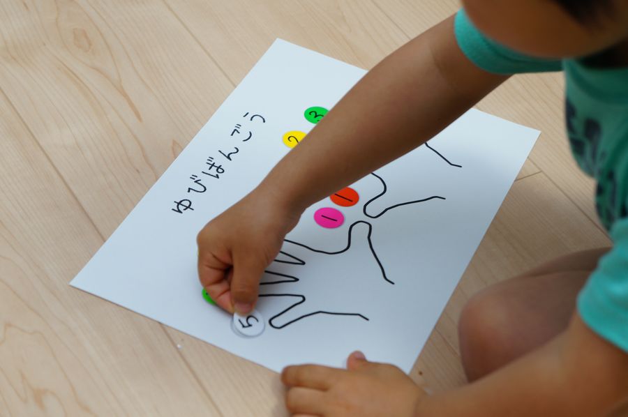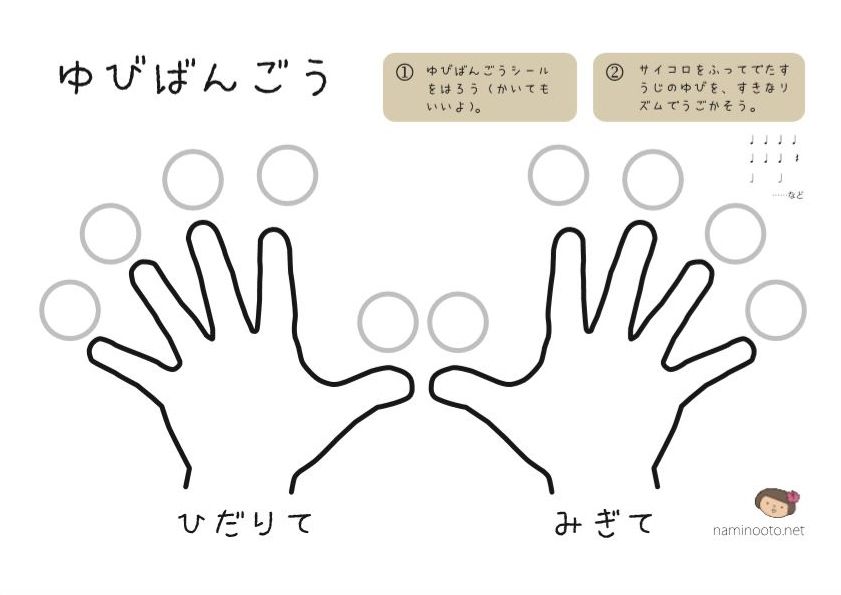 完成したら、ゆびばんごうサイコロを振って、出た数字の指を動かします。遊びながら指番号を覚えます。ゆびばんごうサイコロは以下のページでダウンロードできます。