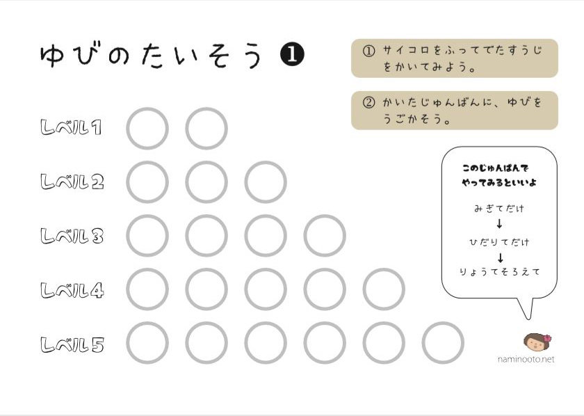 「ゆびのたいそう①」はサイコロを振って出た数字を書き込み、その通りに指を動かしてみます。「ゆびのたいそう②」では、リズムにあわせて練習してみます。いずれも、以下からダウンロードできます。