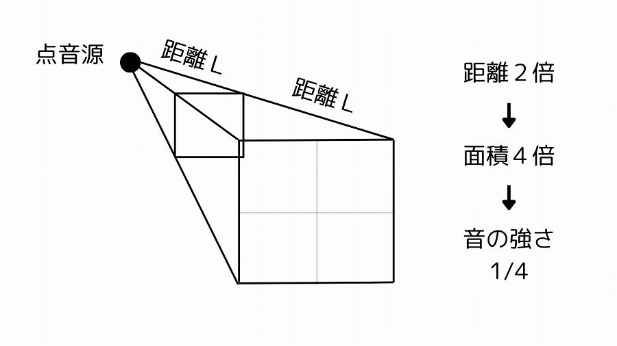 ピアノ1台のみのような点音源で考えると、音の強さは距離の2乗に反比例して小さくなります(減衰する)。