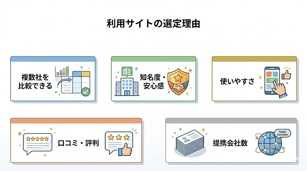 利用サイトを選んだ理由としては、比較のしやすさだけでなく、知名度、大手運営への安心感、口コミ評価、入力しやすさなども多く見られました。