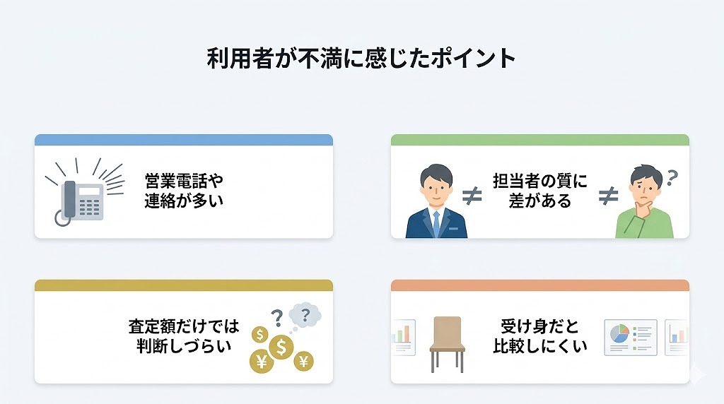これは、一括査定の構造上ある程度避けにくい論点です。便利さの裏側として、連絡量の多さや担当者の質のばらつきが、利用者体験を左右していることがうかがえました。