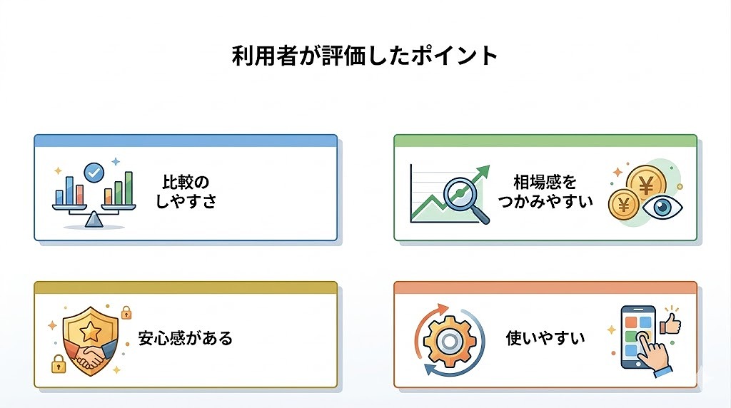つまり、利用者は一括査定サイトを「その場で売却先を決める道具」としてより、「比較材料を集める効率的な入口」として評価している可能性が高いと考えられます。
