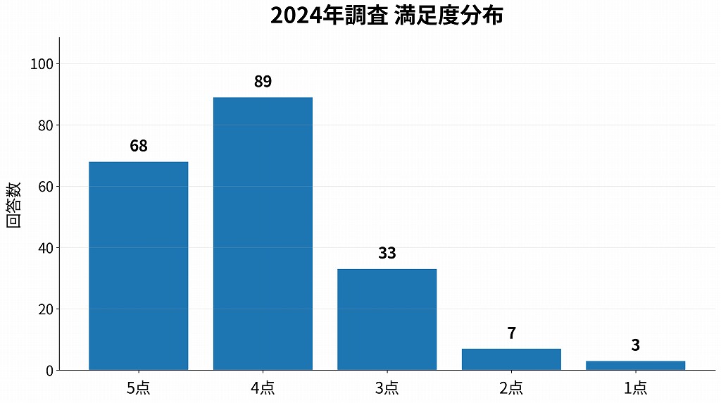確認できた数値を整理すると、2024年調査200件の満足度分布は以下の通りでした。