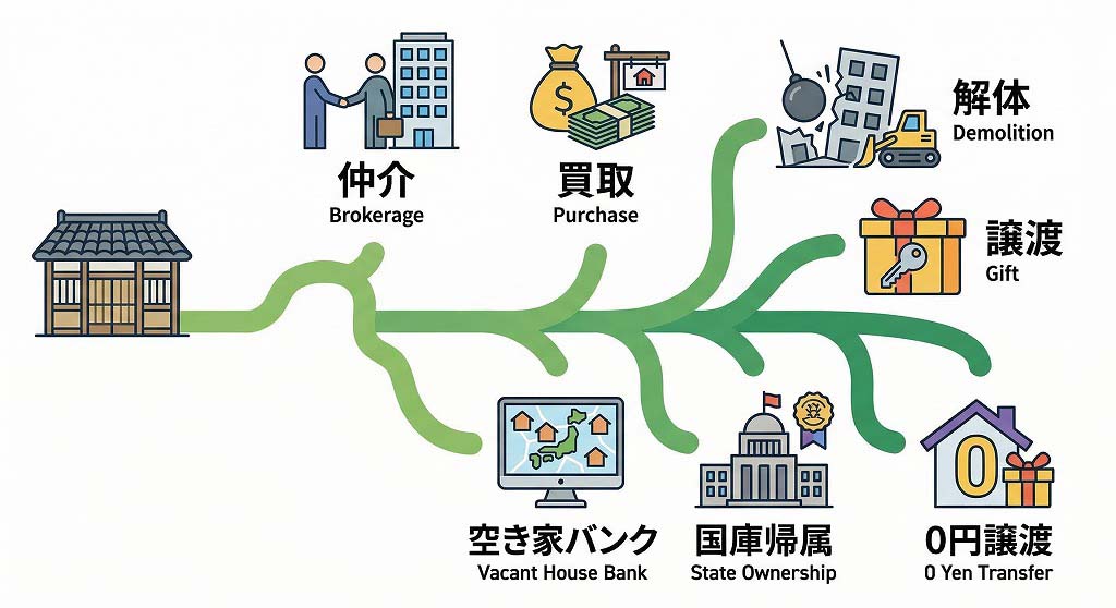 ①不動産会社に仲介を依頼する ②不動産会社や専門業者に買い取ってもらう ③解体して更地として売る ④隣地所有者や第三者に譲る ⑤空き家バンクを使う ⑥相続土地国庫帰属制度を検討する ⑦0円で譲渡するサービスを使う