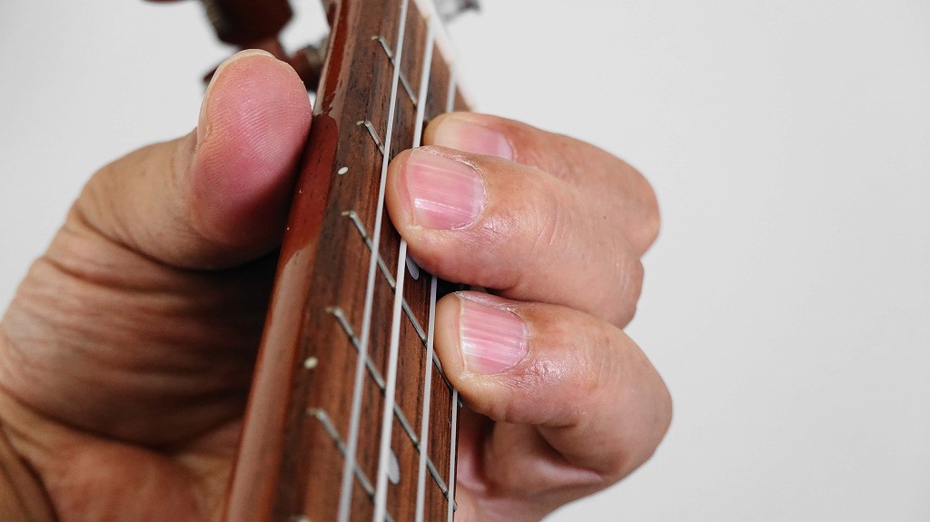 この状態だと指が隣の弦に触れてしまい、きれいな音が鳴りません。