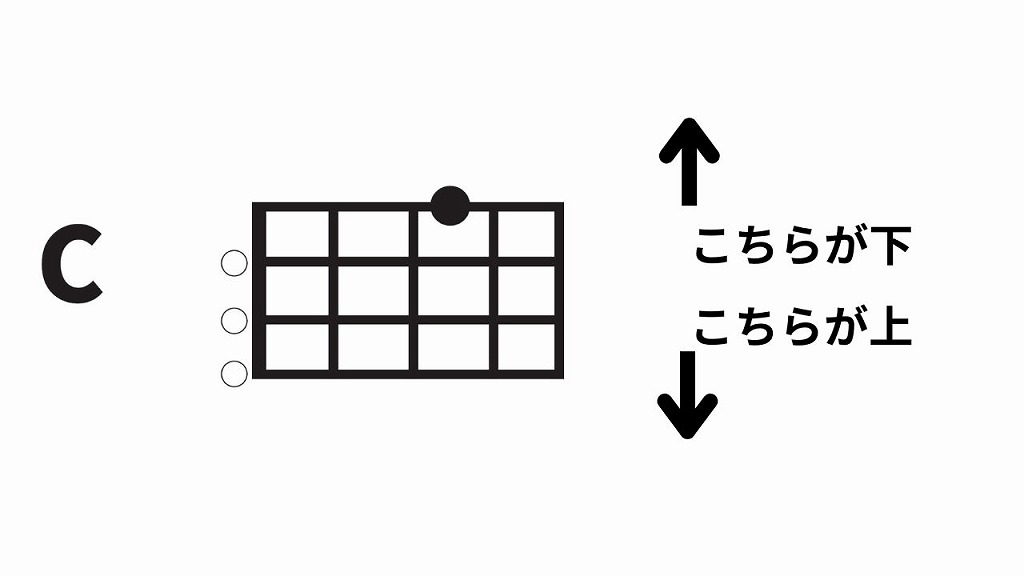 コードダイヤグラムは、上の写真のようにウクレレを自分に向けて90度回転させた時の指板を表しています。