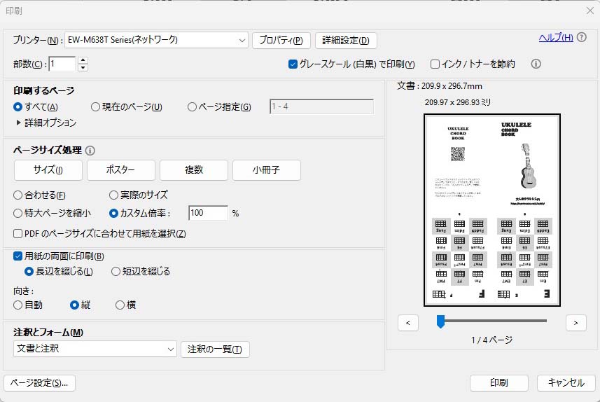 ダウンロードしたPDFを、A4用紙に「両面印刷」してください。 その際、「長辺とじ」の設定で印刷するのがポイントです。