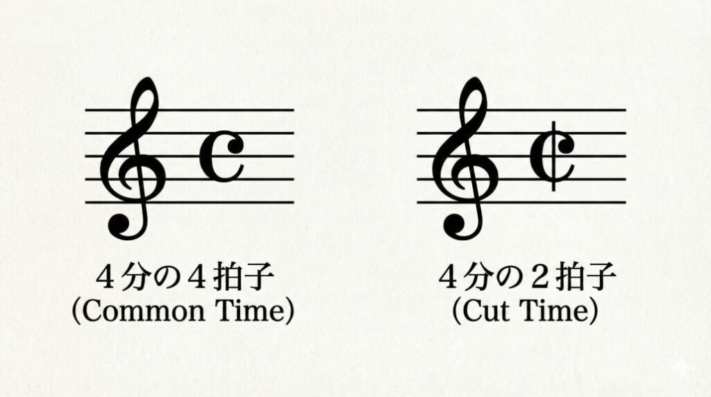 4分の4拍子、2分の2拍子は上図のように書くこともあります(けっこうよく出てきます)。