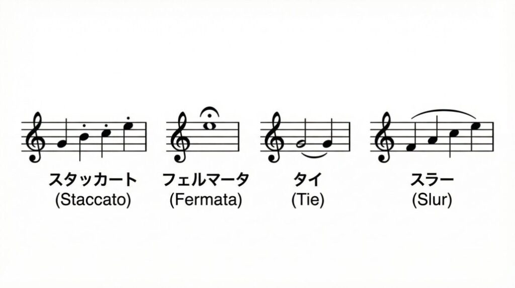 ここまで見てきた音の長さや拍(ビート)を指定する記号の他に、「このように弾いてください」という奏法を指定する記号もあります。