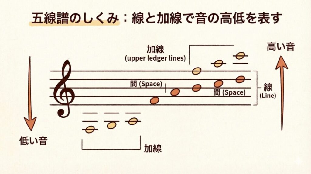 五線譜は上の図のように5つの線とプラスアルファの線(加線)で音の高低を表す楽譜。音の長さ(音価)はこれまでみてきたTAB譜と共通なので、ポジティブに考えれば「あと少しで読めそう」という感じがしますよね。