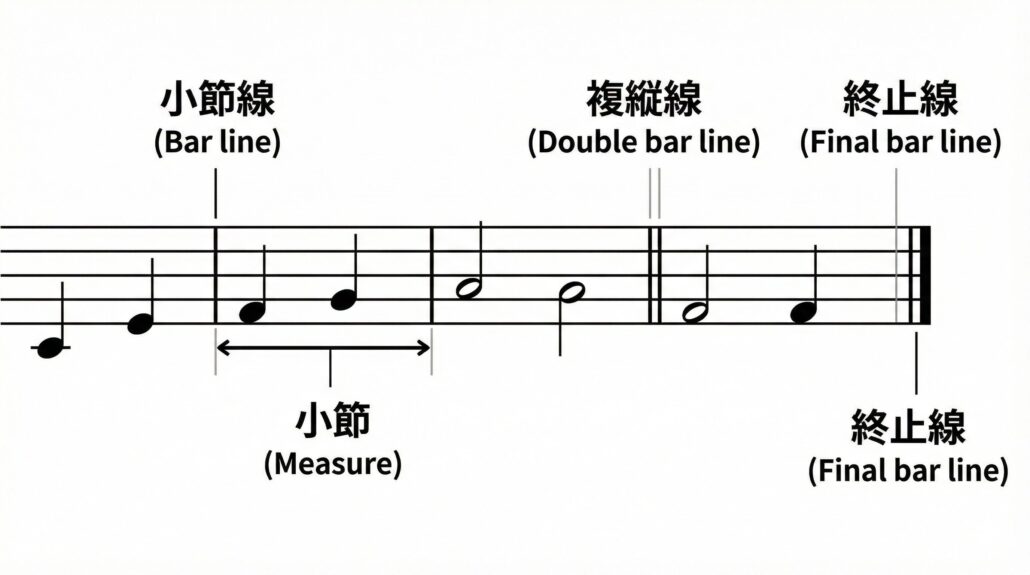 2本線で右が太い小節線は曲の終わりを表し「終止線」と呼ばれます。同じ太さ(細い)の縦線2本の小節線は「複縦線」と呼ばれ、曲の拍子や調が変わる時に使います。