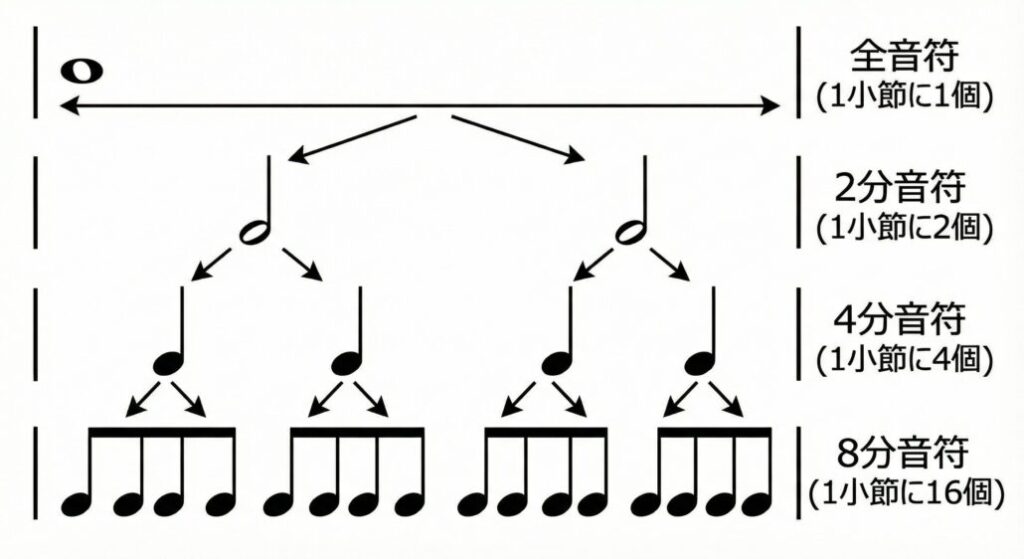 全音符は、小節まるまる1個分の長さです(四拍子の場合)。二分音符はその半分、四分音符はさらにその半分、八分音符はまたその半分です。