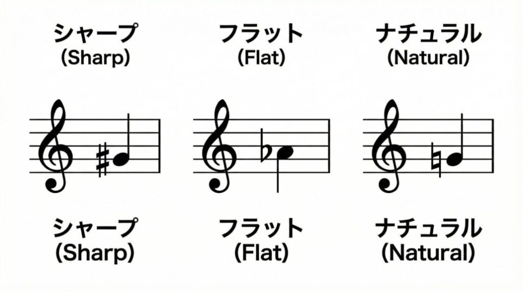 まず変化記号の中でも、演奏中に臨時に音を変える「臨時記号」を説明します。五線譜の楽譜を見ていて、音符に以下の記号がついている場合に、音を少し変化させます。