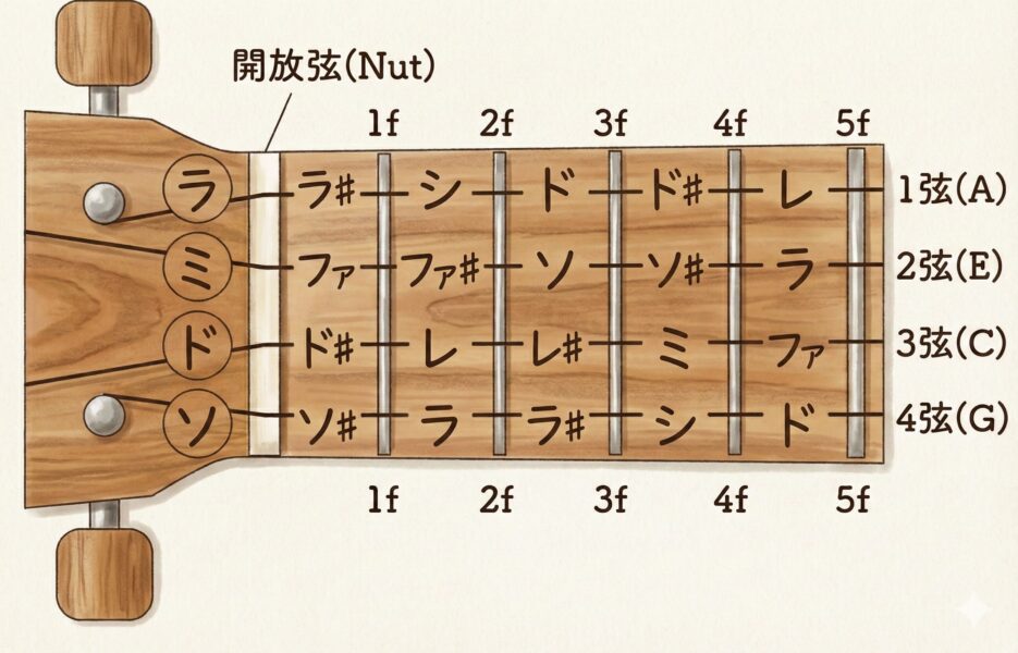 指板上の音は基本的には上の写真のドレミ……を覚えておけばOKですが、より詳しい解説は以下の記事で読めます。