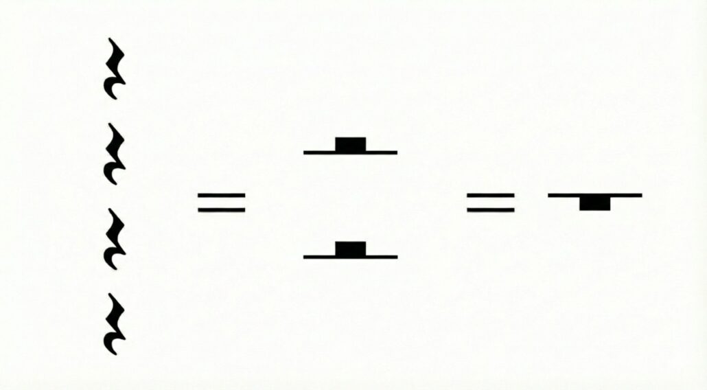 この図は、右から全音符、二分音符、四分音符、八分音符(最後が16分音符)。楽譜が苦手な人でも、なんとなく見覚えがあるのではないでしょうか。