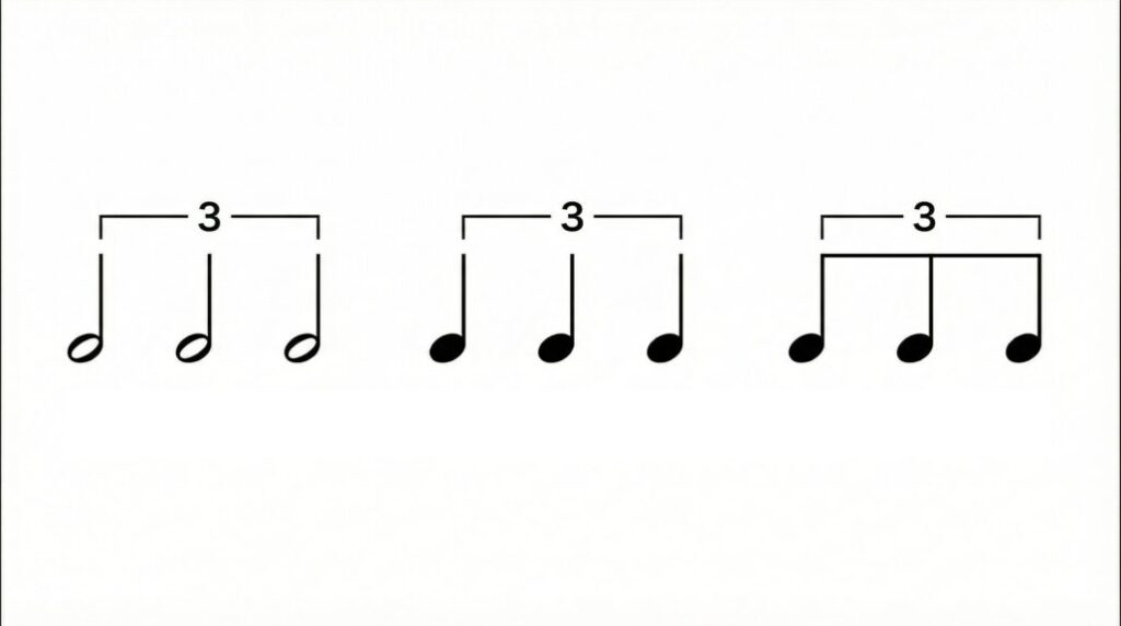 音符の長さを3等分したものが3連符です。元の音符によって書き方が変わります。